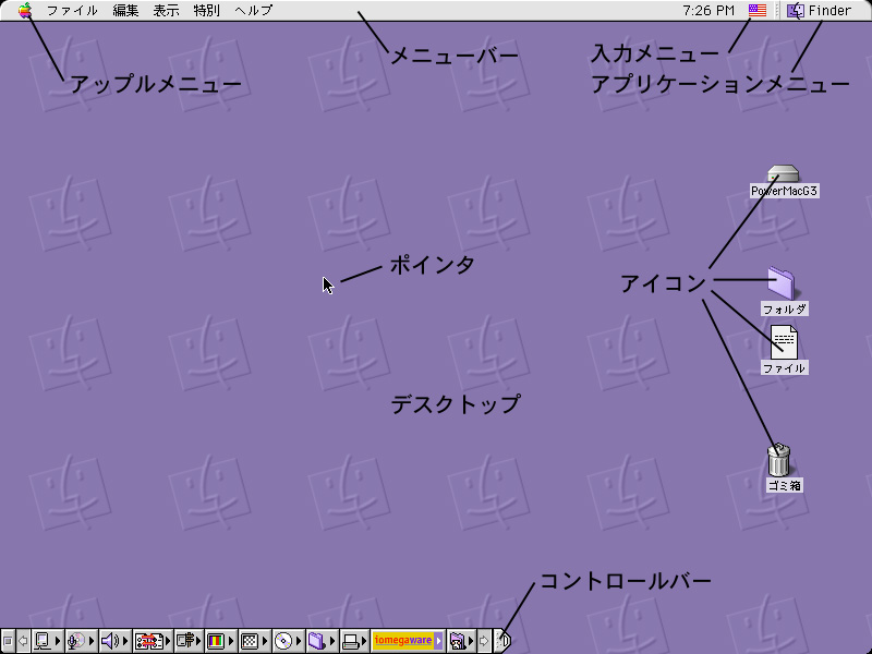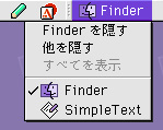 編集、表示、特別、ヘルプという各々のメニューの他にアップルメニュー(左端)、