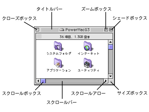 ・ズームボックス:クリックすると最大で画面のサイズまでウィン